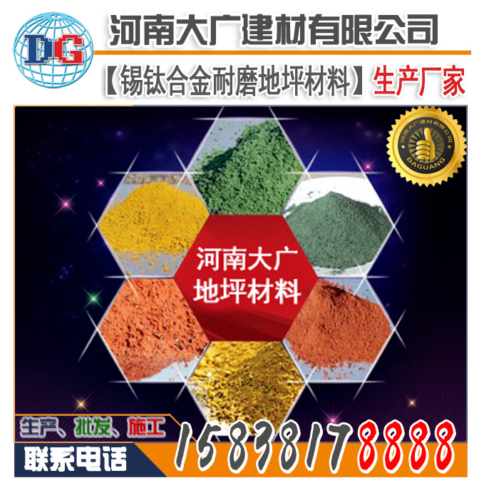 大廣牌錫鈦合金合耐磨地坪材料由一定顆粒級(jí)配的錫鈦合金骨料、高標(biāo)號(hào)水泥、顏料、微硅粉等其它摻合料和外加劑組成。將其均勻地撒布在初凝階段的混凝土表面,經(jīng)專工門(mén)工藝加工,從而使其與混凝土地面形成一個(gè)整體。且具有高致密度性和著色的高性能耐磨地面。